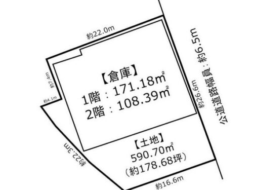 ◆敷地面積約178.68坪!!◆2階建て倉庫床面積約84.56坪◆間口26.6m!車の乗り入れがしやすい物件です◆倉庫・作業場をお探しの方に最適◎◆県道70号線まで車で約1分